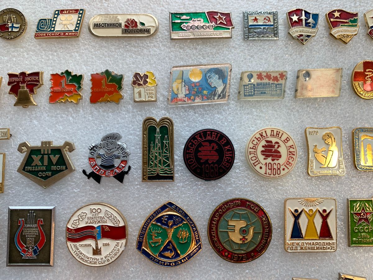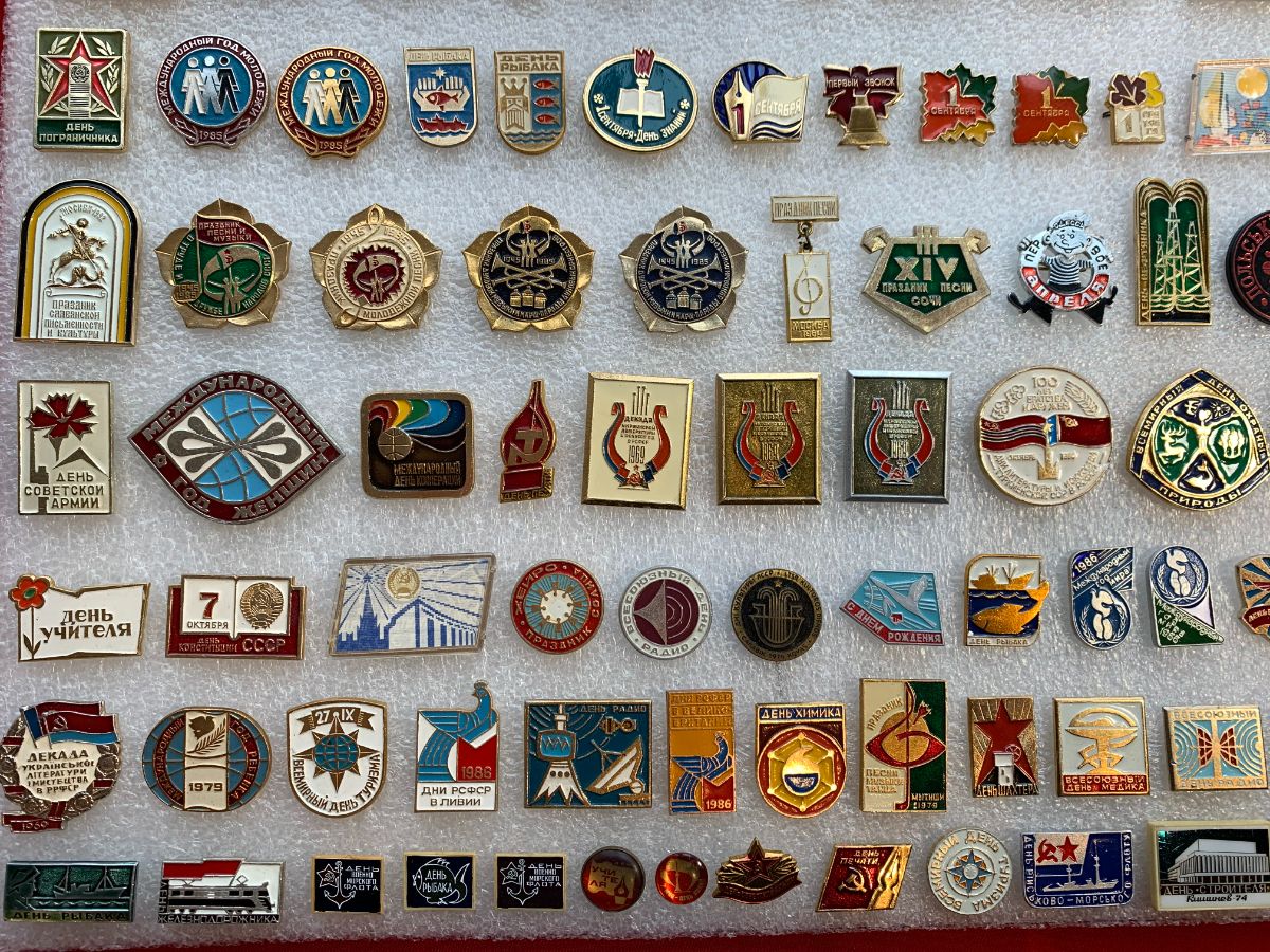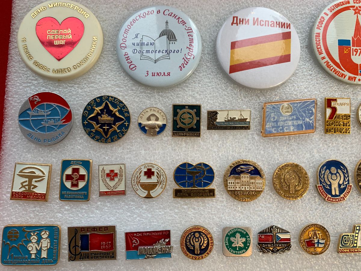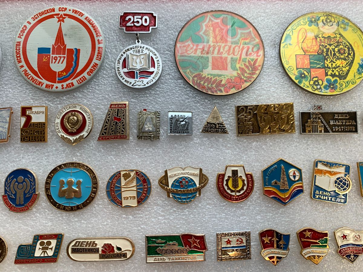 Значки посвященные профессиональным праздникам: День Учителя, День Строителя, День Пограничника, День танкистов, День Пионерии, День рыбака и так далее.