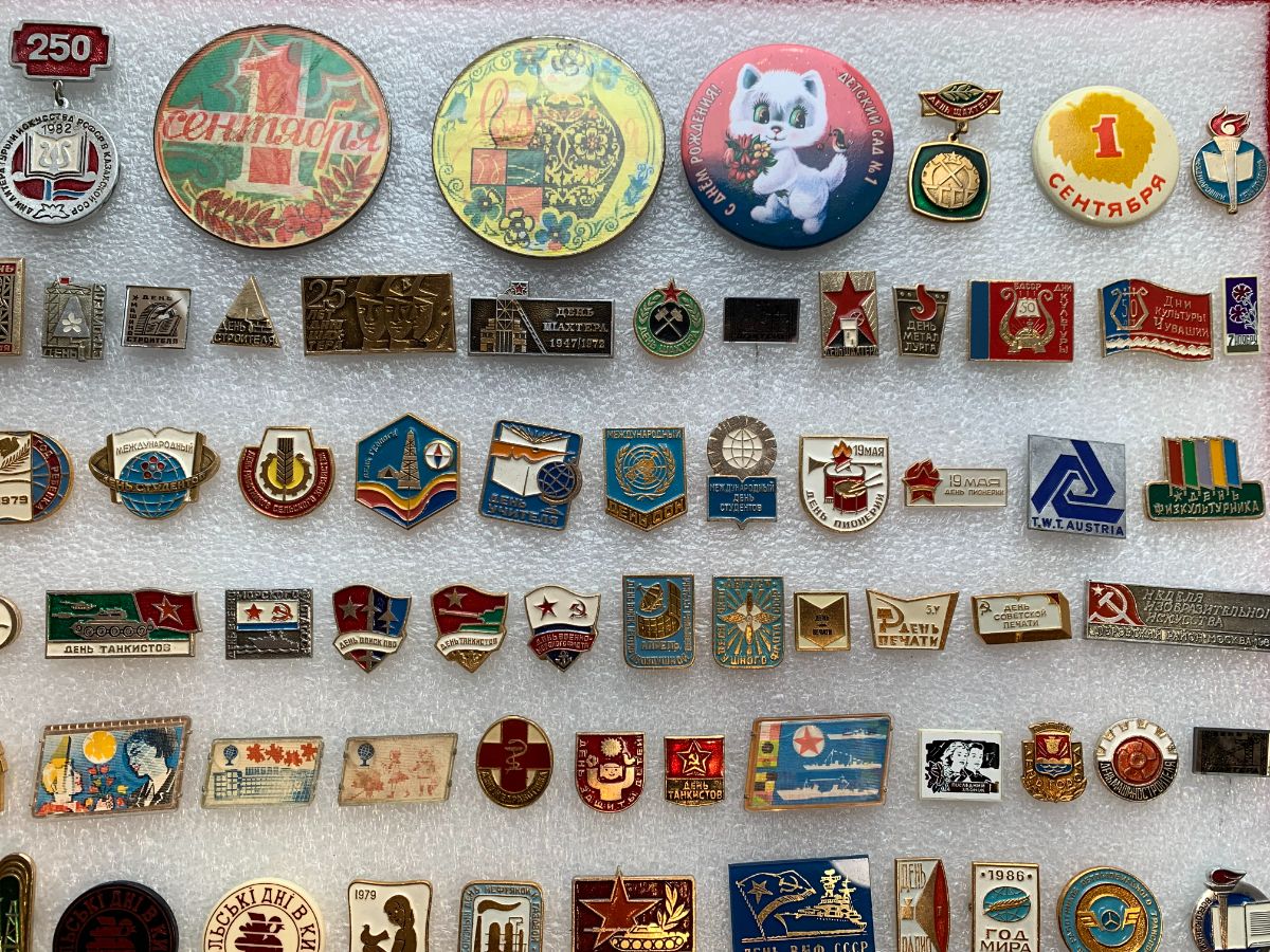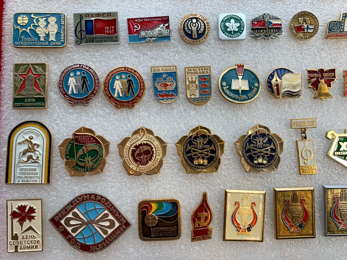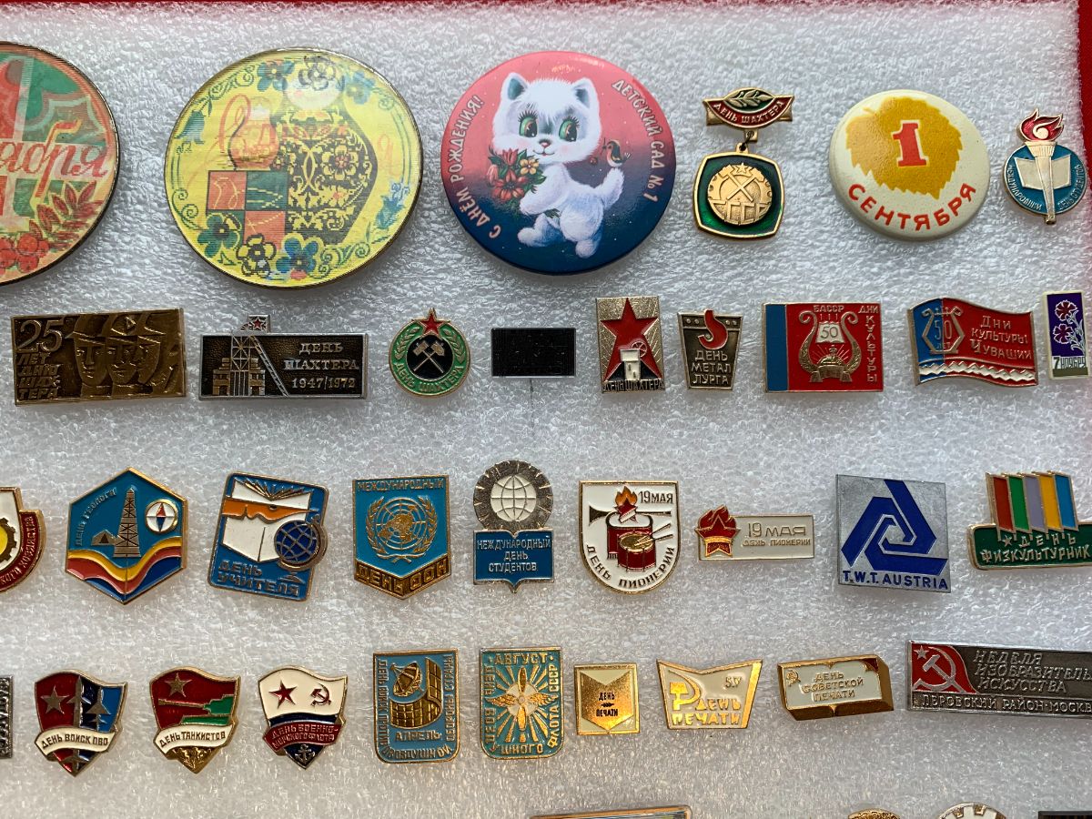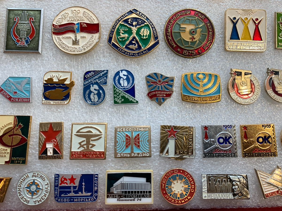 Значки посвященные профессиональным праздникам: День Учителя, День Строителя, День Пограничника, День танкистов, День Пионерии, День рыбака и так далее.