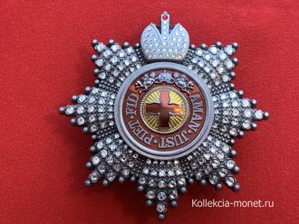 Полноразмерная звезда ордена Святой Анны со стразами и короной, копия LUX! 1797 год. C элементами ручной работы! Выполнена из сплава цветных металлов, с использованием горячих эмалей! Размер 88х88 мм. Вес 116 гр.